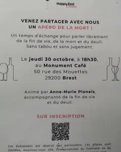 Rendez-vous le jeudi 30 octobre à 18h30 au Monument Café à Brest pour parler de la mort tout en trinquant à la vie !