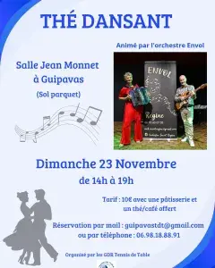 La section Tennis de Table des Gars du Reun vous propose un après-midi dansant le dimanche 23 novembre 2025 de 14h à 19h animé par l'orchestre ENVOL
