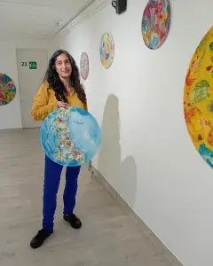 L'artiste expose un ensemble de toiles circulaires colorées et oniriques qui se lisent dans tous les sens (rotation de la toile en fonction de nos envies) et à différentes échelles.