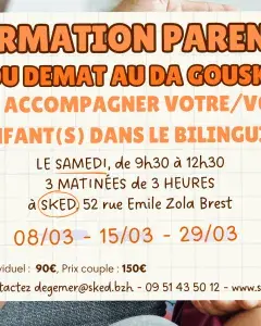 L’objectif de cette formation sur 3 samedis matin est d’apporter aux parents, grands-parents ou personnel éducatif quelques phrases à utiliser au quotidien. Une première approche du vocabulaire de base (repas, corps, hygiène, loisirs, etc), ainsi que des phrases types à utiliser tout au long de la journée avec l’enfant !