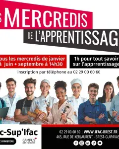 Participez aux Mercredis de l’apprentissage : 1h pour tout savoir sur l’alternance ! Vous avez entre 15 et 29 ans et vous vous interrogez sur votre avenir ? La formation par apprentissage vous intéresse mais vous manquez d’information ? L’Ifac – Sup’Ifac au Campus des métiers, centre de formation par alternance géré par la CCI Finistère reprend ses Mercredis de l’apprentissage et vous accueille tous les mercredis de janvier à juin (et 3 dates en septembre) à 14h30 dans ses locaux !