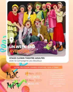 Ce stage se déroule en week-end. Le samedi de 14h à 19h30 et le dimanche de 9h30 à 17h. Il est animé par la Compagnie Les Décalous.