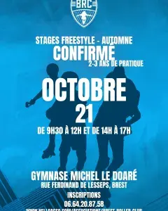 Le Brest Roller Club organise un stage freestyle confirmé pendant les vacances de la Toussaint, le mardi 21 octobre 2025 de 9h30 à 17h00.