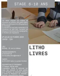 L’atelier litho livre, qui permettra à votre enfant (6-10 ans) de concevoir en commun une petite édition grâce à la technique de la lithographie.